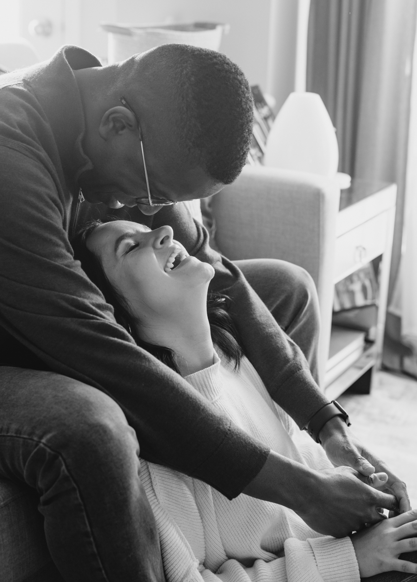Relaxed at home Engagement Session in edmonton with Champagne and cuddles. Candid moments with laughter and poses. Sherwood Park Photographer